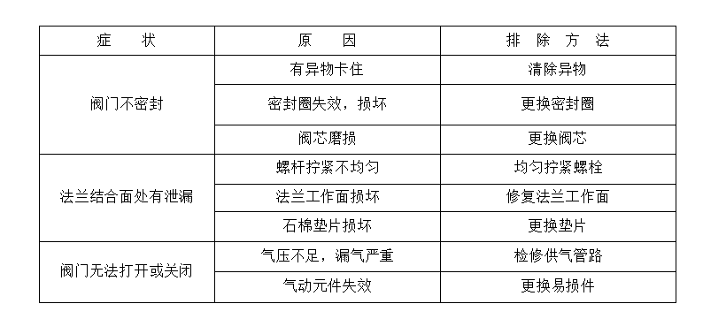 六、安裝使用要點(diǎn) 1)安裝前仔細(xì)閱讀本說(shuō)明書,并核對(duì)閥門型號(hào)、通徑及技術(shù)參數(shù)。 2)嚴(yán)禁裝上閥門后施焊法蘭,以免損壞閥門密封圈。管道自先預(yù)留的閥門安裝距離應(yīng)適應(yīng),法蘭兩邊加墊片。 3)兩管道中心與閥門通徑中心應(yīng)保持同軸,法蘭面應(yīng)平整,不允許法蘭面有較大的偏斜,以保證閥門的夾緊和正常工作。擰緊螺栓應(yīng)做到均勻?qū)ΨQ。 4)該閥門出廠前已做調(diào)整和動(dòng)態(tài)試驗(yàn),氣路已經(jīng)連接完好。 5)主要易損件為密封圈和閥芯。 七、常見(jiàn)故障及排除方法
